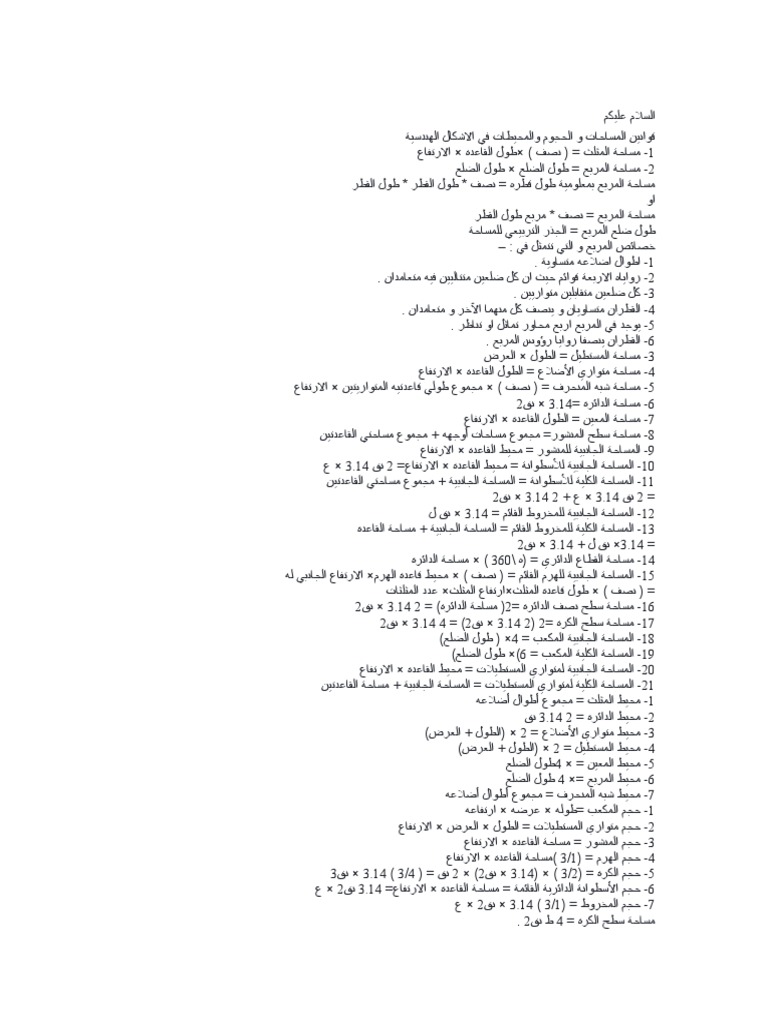 مساحات وحجوم قوانين الاشكال الهندسية بالعربي
